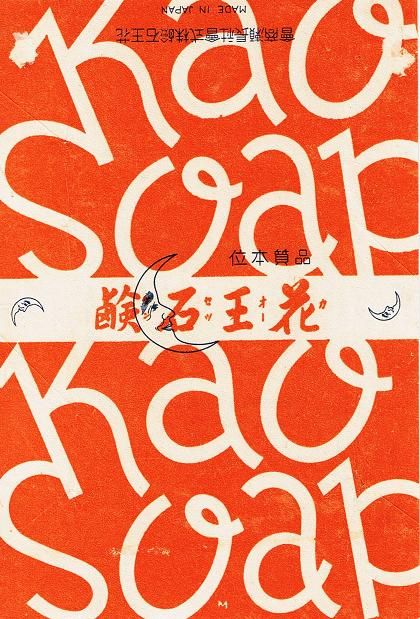Hara had a vested interest in modern typography and was heavily influenced by Western design, leading him to translate Jan Tschichold’s The New Typography from German to Japanese in 1932.40 The brand name Kaō Sekken in kanji refers to Chinese poetic tradition, recalling the fragrance of the peony, known as “king of a hundred flowers.”41 Despite the promising associations such a reference could lend the soap product, the character combination would not have been universally understood: for this reason, the small katakana set vertically next to the kanji letters operate as “phonetic reading marks,” guiding Japanese readers through the word’s pronunciation.42 Hara’s design, utilizing a very modern style reflected in the typography and color choice, was simple yet complex, but visually striking overall. The large, loopy rōmaji logotype spelling “Kaō Soap” would have appeared foreign and fresh, identifying the brand with the national modernization trend. All the while, it maintains a distinct Japanese aura by embracing its native visual language, deployed in a handful of ways, in addition to the bold red color that subtly suggests, whether or not intentional, the national flag.