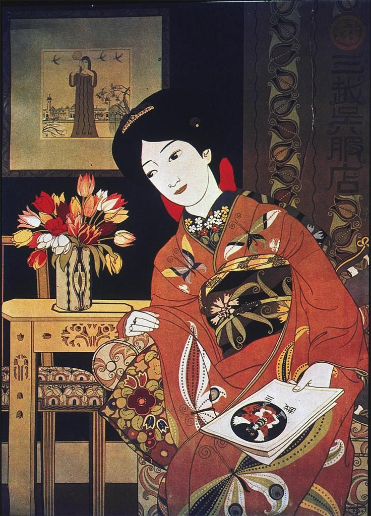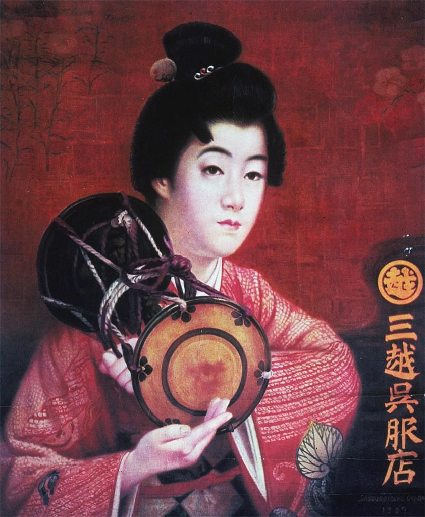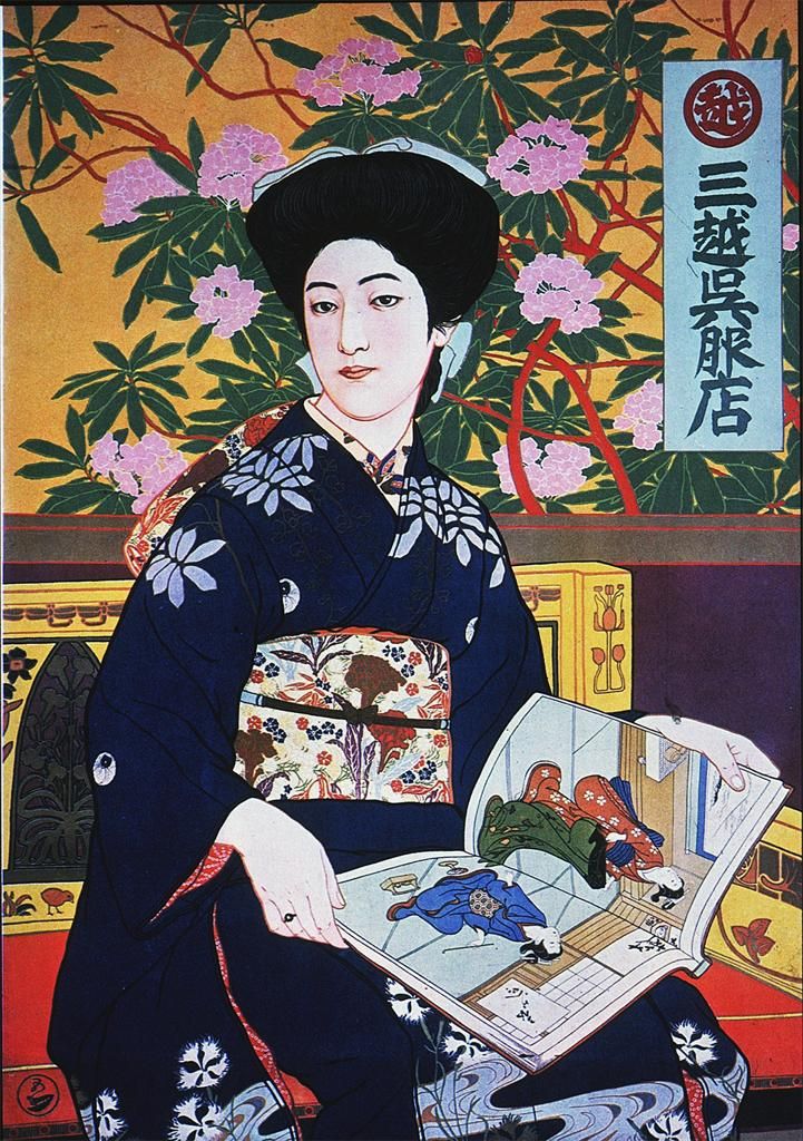 A leader in this style of branding, the Mitsukoshi department store reproduced the Western-style oil painting Portrait of a Woman from 1907 (fig. 1) by the oil painter Okada Saburosuke as a chromolithograph imitating the look of several layers of oil paint (fig. 2).16